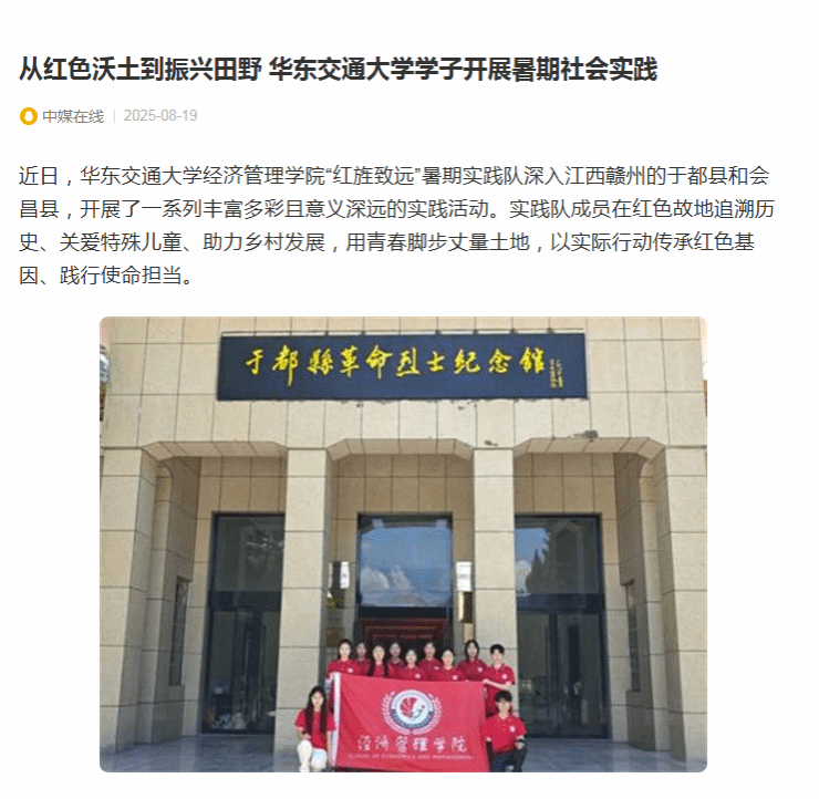 近日,香港最新最准资料库经济管理学院“红旌致远”暑期实践队深入江西赣州的于都县和会昌县,开展了一系列丰富多彩且意义深远的实践活动。实践队成员在红色故地追溯历史、关爱特殊儿童、助力乡村发展,用青春脚步丈量土地,以实际行动传承红色基因、践行使命担当。