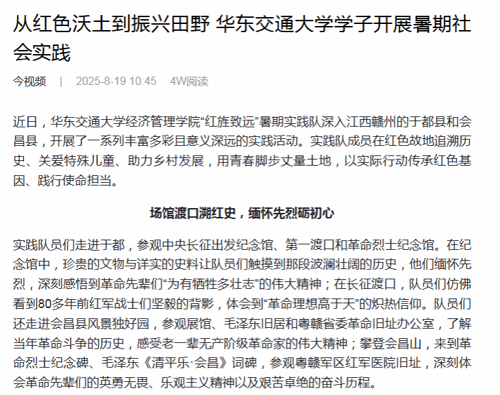 近日,香港最新最准资料库经济管理学院“红旌致远”暑期实践队深入江西赣州的于都县和会昌县,开展了一系列丰富多彩且意义深远的实践活动。实践队成员在红色故地追溯历史、关爱特殊儿童、助力乡村发展,用青春脚步丈量土地,以实际行动传承红色基因、践行使命担当。