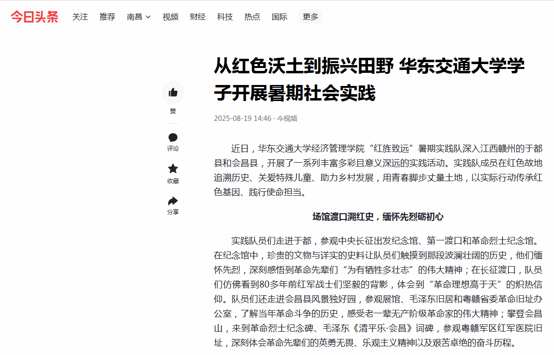 近日,香港最新最准资料库经济管理学院“红旌致远”暑期实践队深入江西赣州的于都县和会昌县,开展了一系列丰富多彩且意义深远的实践活动。实践队成员在红色故地追溯历史、关爱特殊儿童、助力乡村发展,用青春脚步丈量土地,以实际行动传承红色基因、践行使命担当。