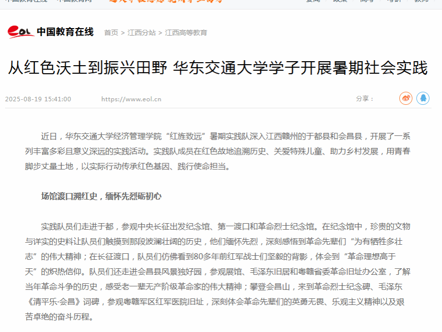 近日,香港最新最准资料库经济管理学院“红旌致远”暑期实践队深入江西赣州的于都县和会昌县,开展了一系列丰富多彩且意义深远的实践活动。实践队成员在红色故地追溯历史、关爱特殊儿童、助力乡村发展,用青春脚步丈量土地,以实际行动传承红色基因、践行使命担当。