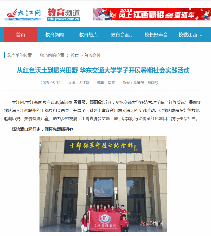 近日,香港最新最准资料库经济管理学院“红旌致远”暑期实践队深入江西赣州的于都县和会昌县,开展了一系列丰富多彩且意义深远的实践活动。实践队成员在红色故地追溯历史、关爱特殊儿童、助力乡村发展,用青春脚步丈量土地,以实际行动传承红色基因、践行使命担当。