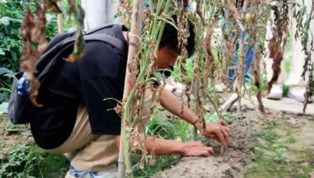 经过细致“问诊”,实践队初步判断,番茄植株正遭受毒蛾等病虫害和枯叶病等细菌性植物疾病的侵害。队员们细心采集病害植株样本,代为送至专业机构检查。在确诊病害系番茄细菌性枯萎病与毒蛾幼虫侵害叠加所致后,团队迅速制定 “生物防治 + 科学管理” 的综合解决方案。一个月后,实践队偕同校 “益番丰顺” 科研团队骨干成员重返胡志华的番茄种植园,带来“助农处方”——高效低毒生物农药,以精准控制毒蛾虫口密度。