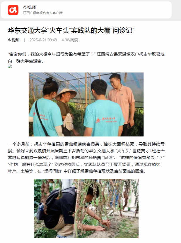 从校园到大棚,从书本到实践,这场持续一个月的 “问诊”,不仅帮农户解决了实际问题,更生动诠释了知识的力量。未来,实践队将继续发挥桥梁纽带作用,畅通诉求反映通道,第一时间将调研实情与农民心声向上传递,凝聚社会合力纾解难题,以务实行动回应乡亲们的 “急难愁盼”,为绘就乡村振兴壮美画卷贡献青春智慧和力量。