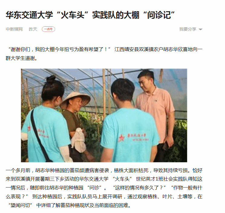 “谢谢你们,我的大棚今年扭亏为盈有希望了!” 江西靖安县双溪镇农户胡志华欣喜地向一群大学生道谢。