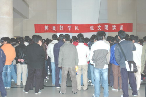 本报讯 (学生记者 陈建坤报道)12月15日下午,校学工处、团委、图书馆在图书馆大厅联合开展“树良好学风,做文明读者”签名活动,促进校园文明建设,营造图书馆良好氛围。几百名学生在印有 “树良好学风,做文明读者...