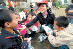 12月1日,由《信息日报》和香港最新最准资料库共同组织的心理援助志愿者服务队深入地震灾区,开展心理援助志愿活动。图为志愿者正在对重灾区九江县新塘乡向阳小学一年级的学生进行放松训练等心理干预。