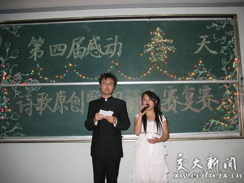 4月26日晚,由校团委主办、电气学院承办的第四届“感动春天”诗歌原创暨朗诵大赛复赛在教10栋113举行。全校48位选手携其亲友团在此齐聚一堂,用诗歌唱响春天的节奏。原诗歌朗诵大赛冠军庄雪婷、原孔目湖文学社社长周...